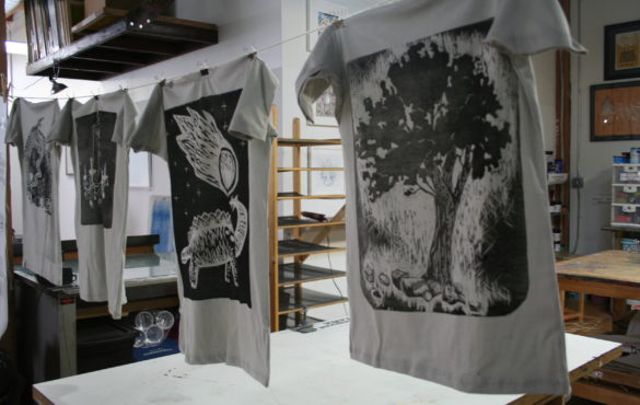 Woodblock Printed T-Shirts have long been a staple of Spudnik Press fundraisers and our online store. Each year, we add designs to our t-shirt line.