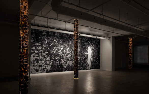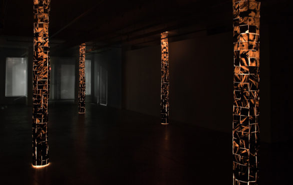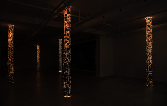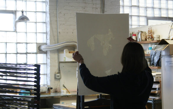 Current Artist in Residence, Kate McQuillen, has had a busy fall. She just returned from Toronto, where she spent a week mounting a large-scale installation for her solo exhibition, Dead Reckoning, at O’Born Contemporary. A large wall piece and tall, sentry-like glowing pillars are composed of fragmented and reassembled monoprints, many created this fall at Spudnik Press.