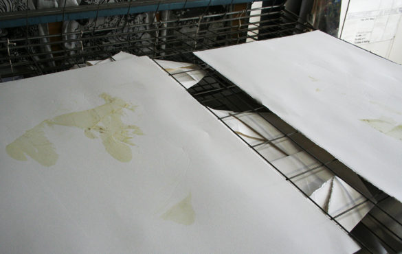 Much of Kate’s time at Spudnik press has been spent experimenting with the process of transferring ink to paper. For example, one trial involved inking then folding sheets of paper and sending through the press. Kate was less interested in the original sheet or paper, and more interested in the abstraction that resulted from excess ink transferring to the protective top sheet.