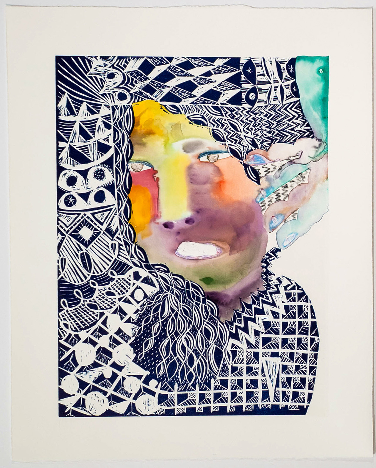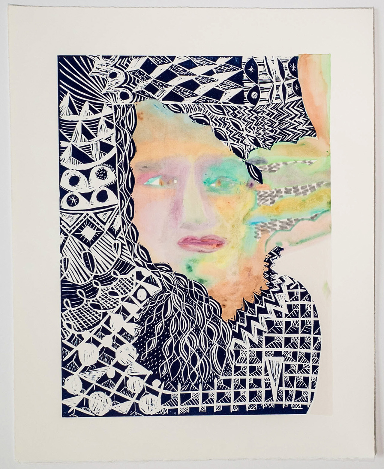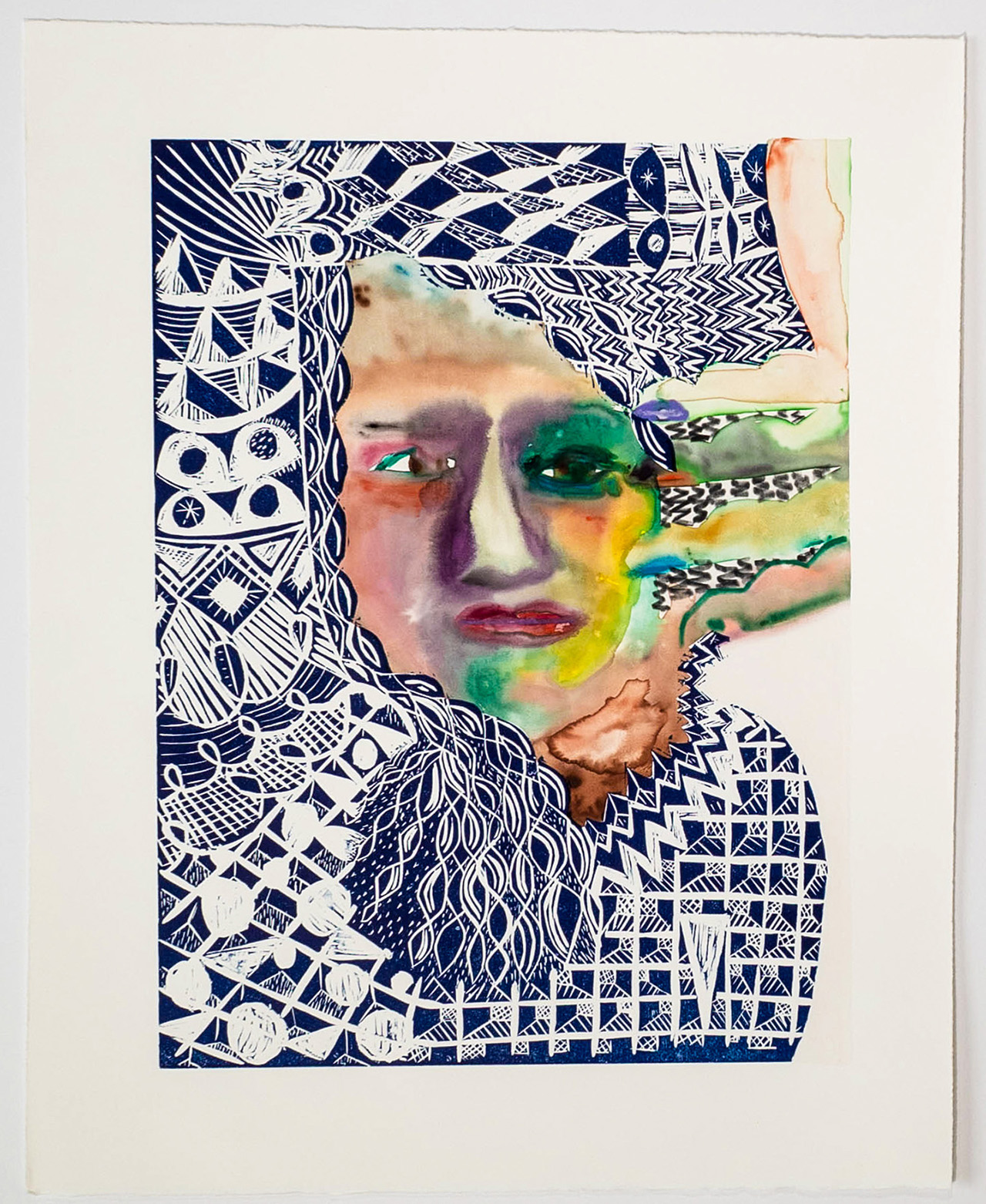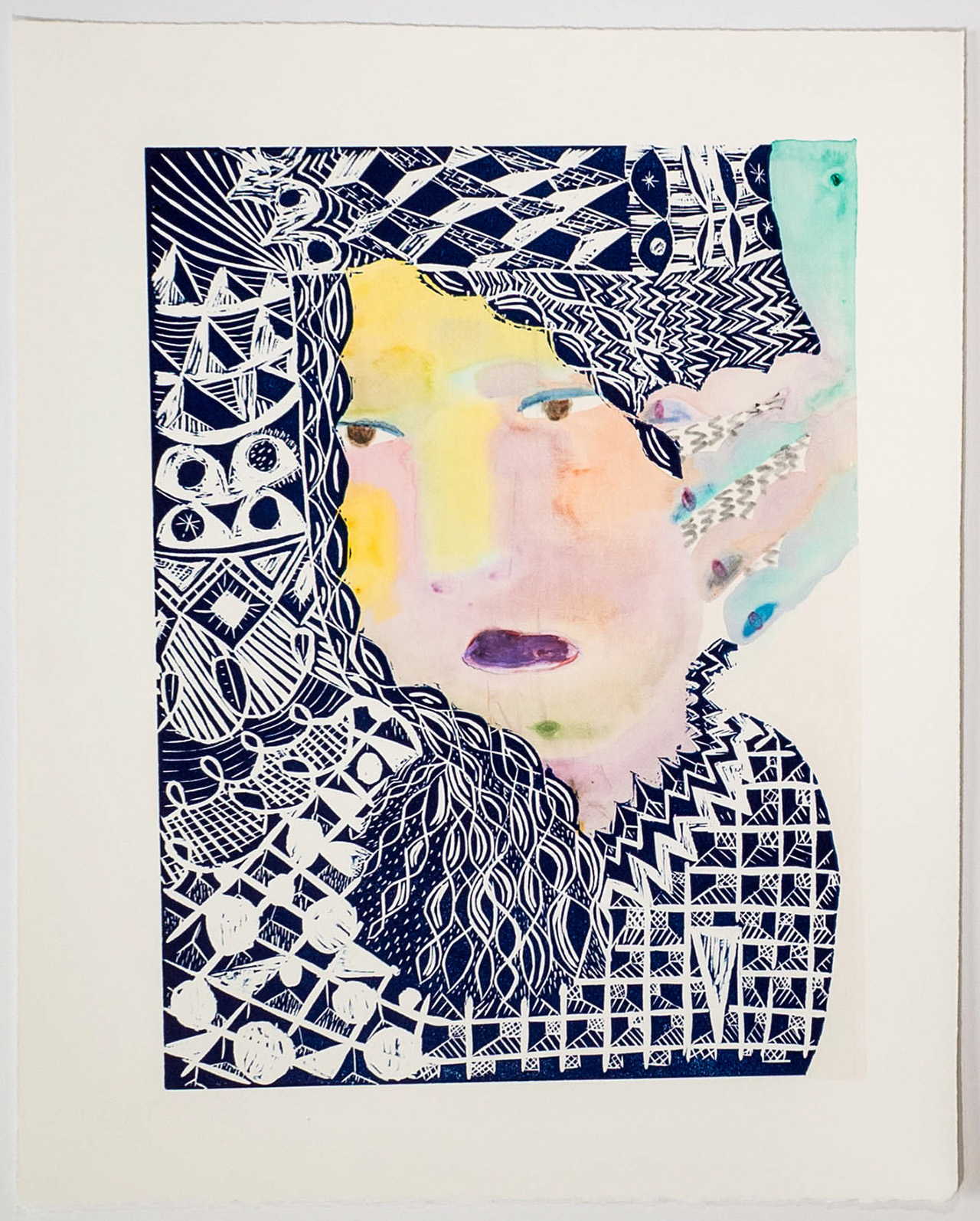 “I wanted to collide different techniques. I wanted elements of each prints to be unique. Since I never did anything like this before, I didn’t have any preconceived notations about what this would be. The faces were painted on the spot onto a screen. It was really hard to gage how they would turn out before they were printed. We usually took three pulls out of each mono print, and it was really profound how very different each of the resulting prints vibes despite coming from the same painting.” – Selina Trepp