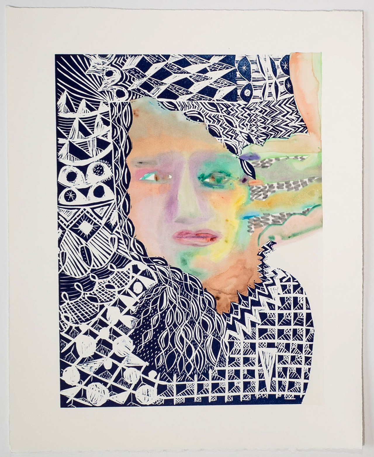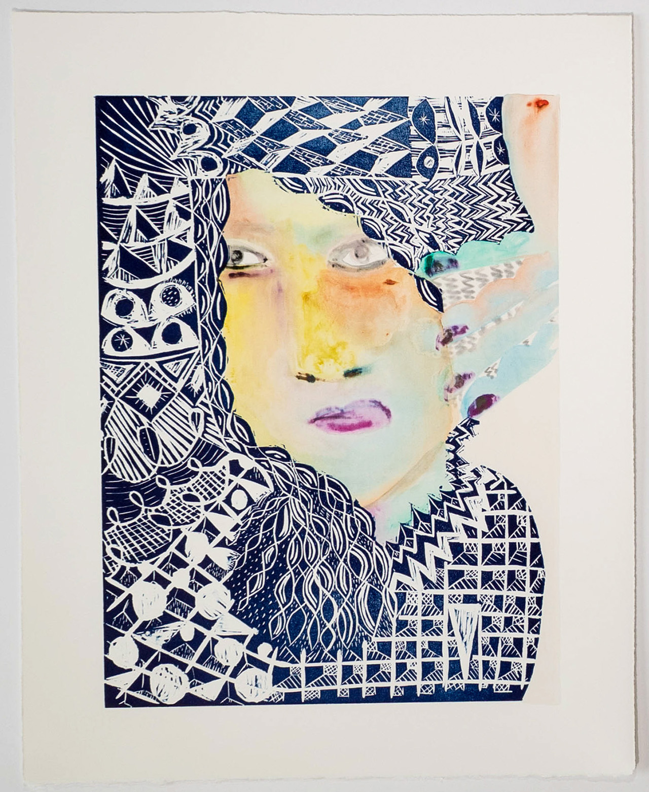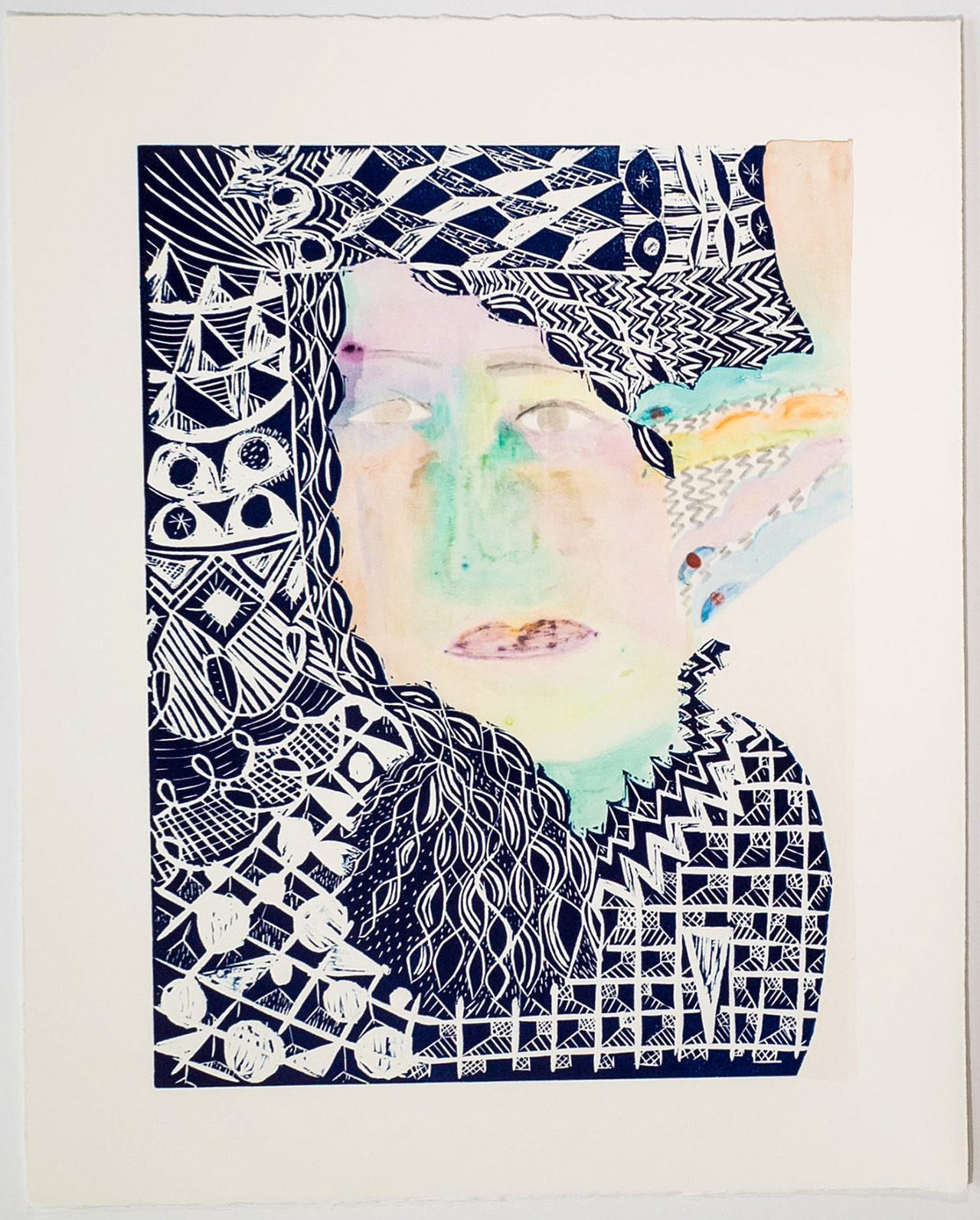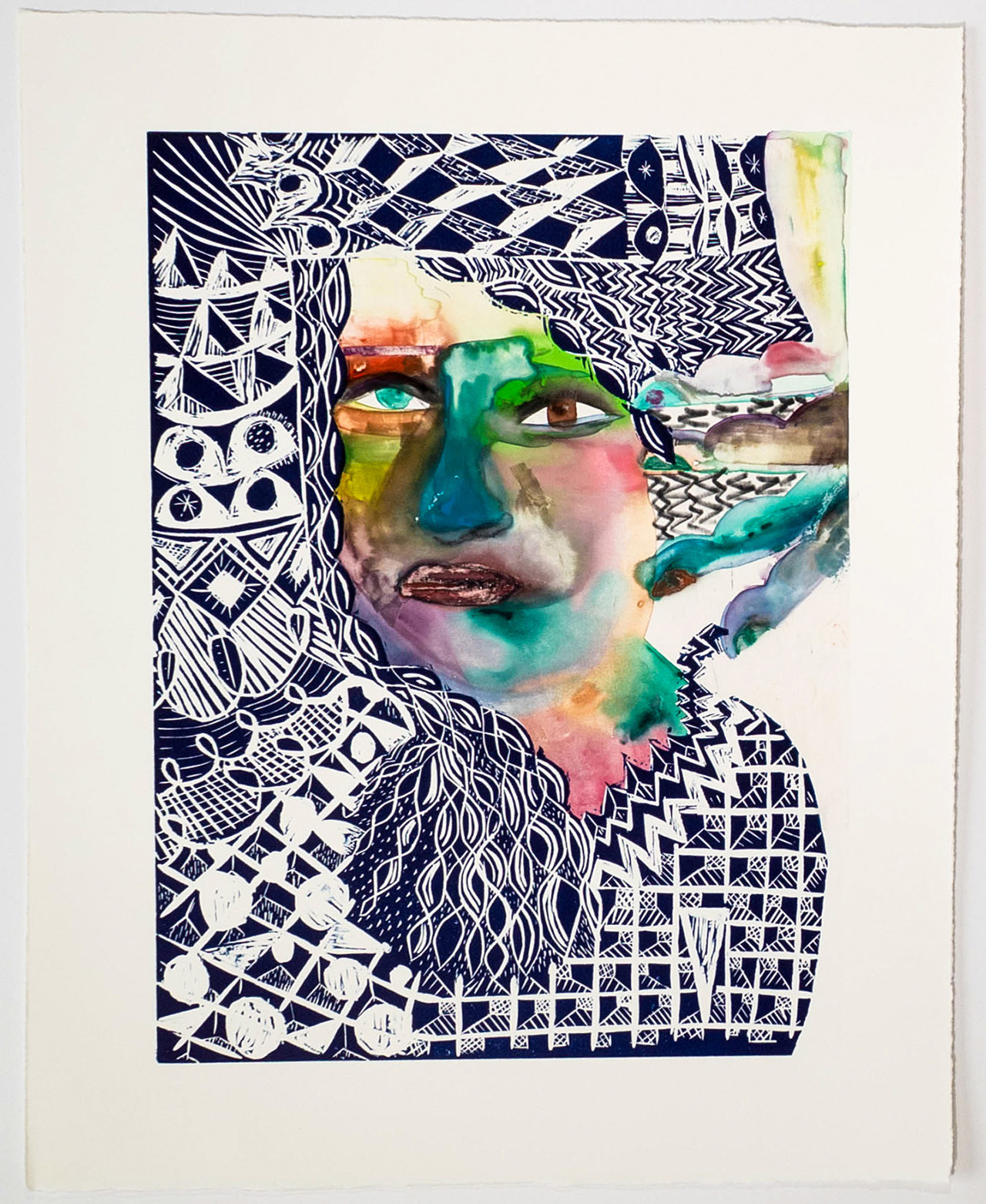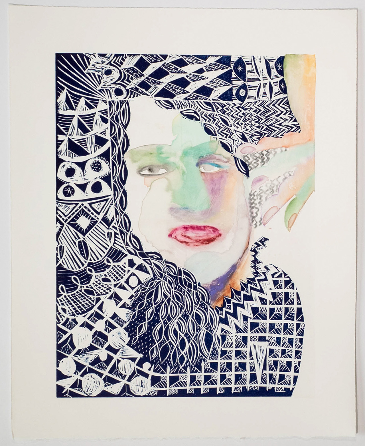 “I wanted to collide different techniques. I wanted elements of each prints to be unique. Since I never did anything like this before, I didn’t have any preconceived notations about what this would be. The faces were painted on the spot onto a screen. It was really hard to gage how they would turn out before they were printed. We usually took three pulls out of each mono print, and it was really profound how very different each of the resulting prints vibes despite coming from the same painting.” – Selina Trepp