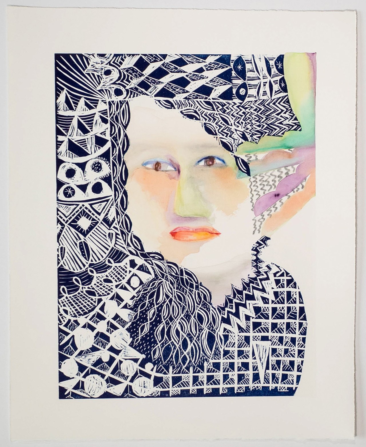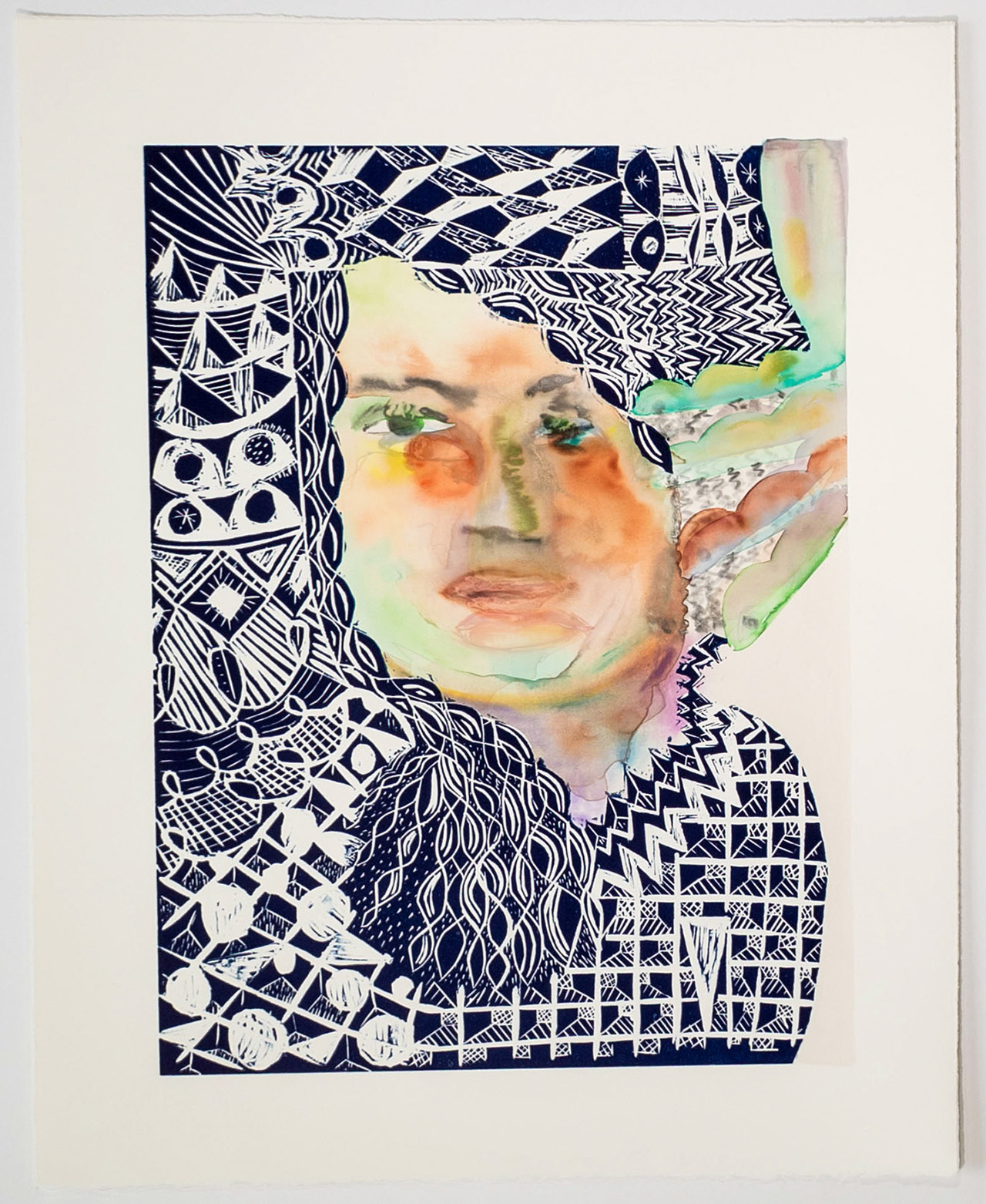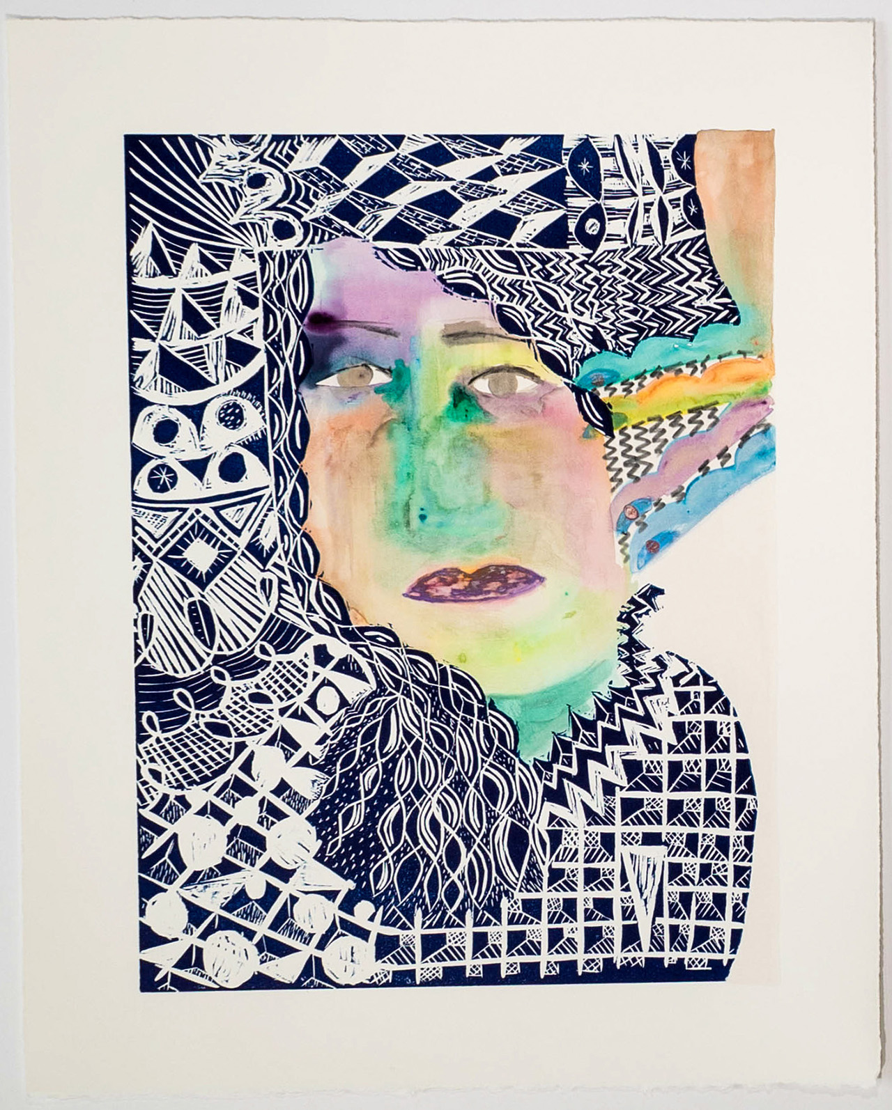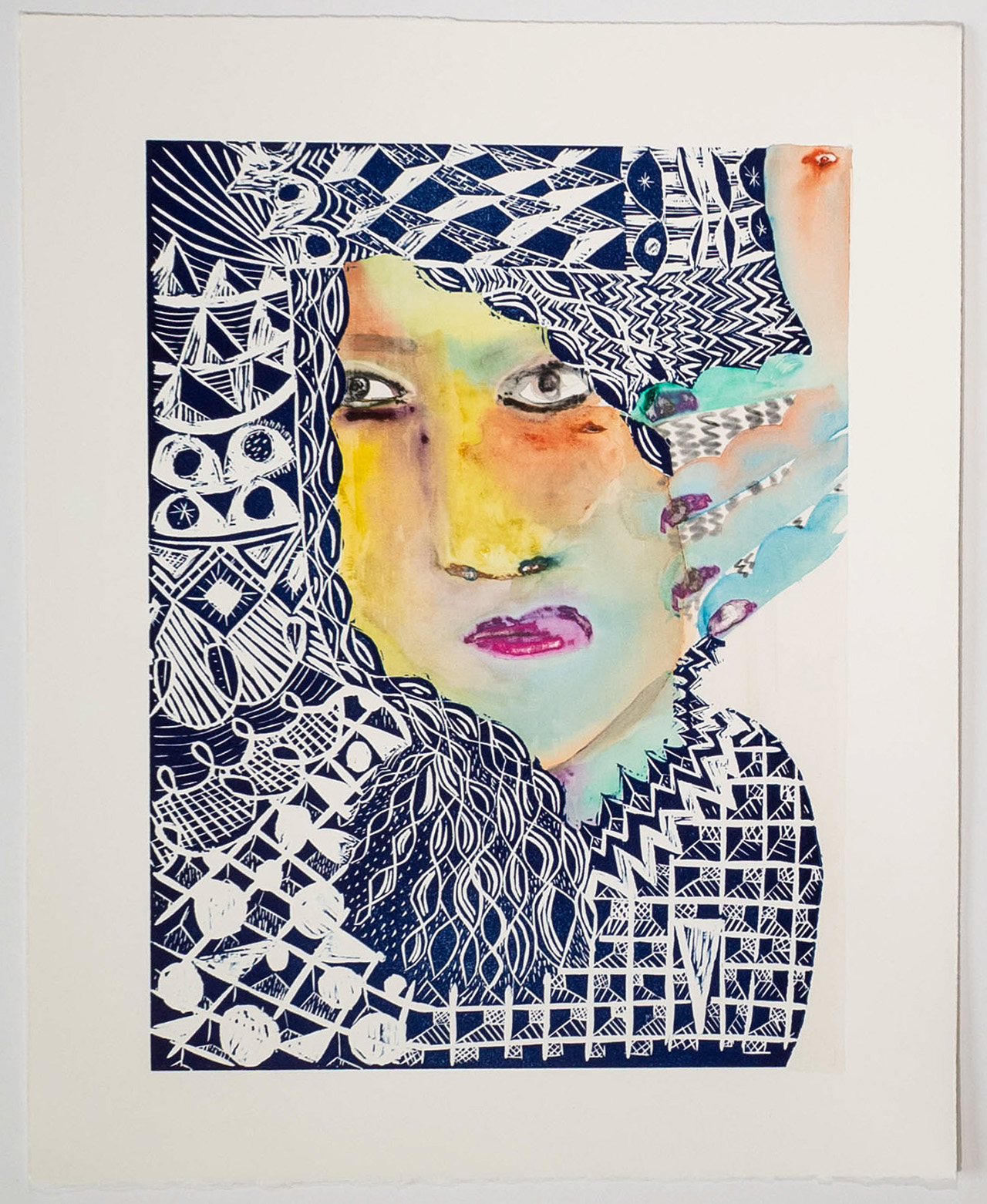 “I wanted to collide different techniques. I wanted elements of each prints to be unique. Since I never did anything like this before, I didn’t have any preconceived notations about what this would be. The faces were painted on the spot onto a screen. It was really hard to gage how they would turn out before they were printed. We usually took three pulls out of each mono print, and it was really profound how very different each of the resulting prints vibes despite coming from the same painting.” – Selina Trepp