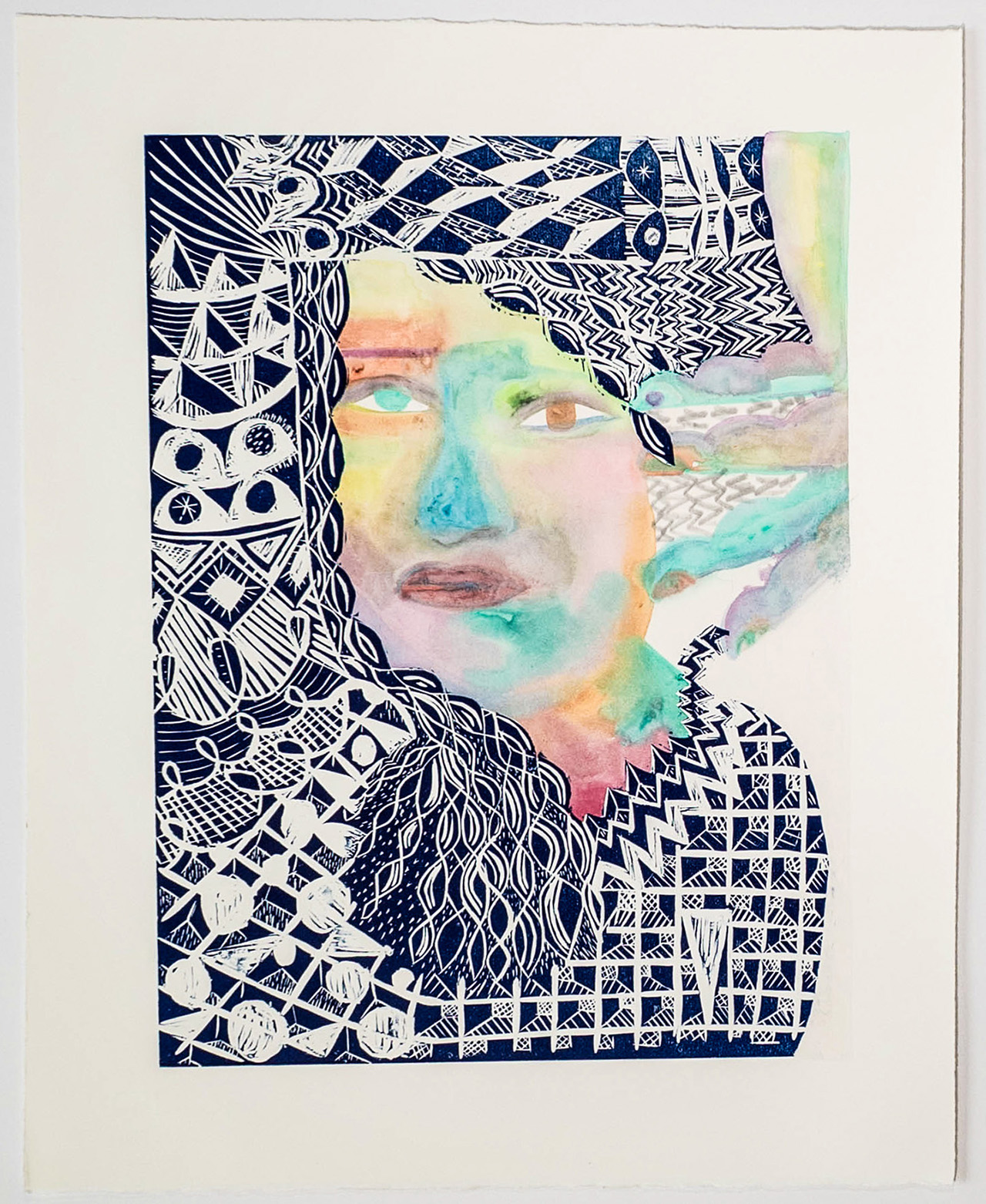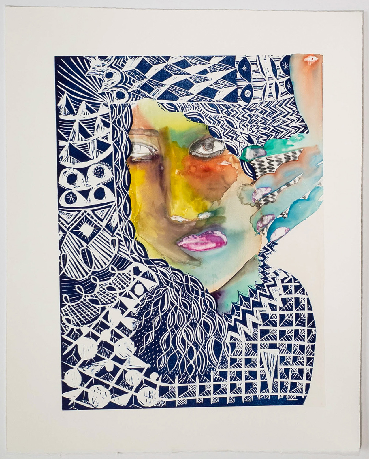 “It’s all beauty. It’s all death.” are prints showing complex women living freely and not trying to please or perform. The patterning in both the garment and the background reference those found in sgrafitto murals from the region in Switzerland where Trepp is from. By using these patterns, which are similar to mural patterns found in indigenous architecture in India, Africa, and South America, these prints point to a universal language via geometric patterns.