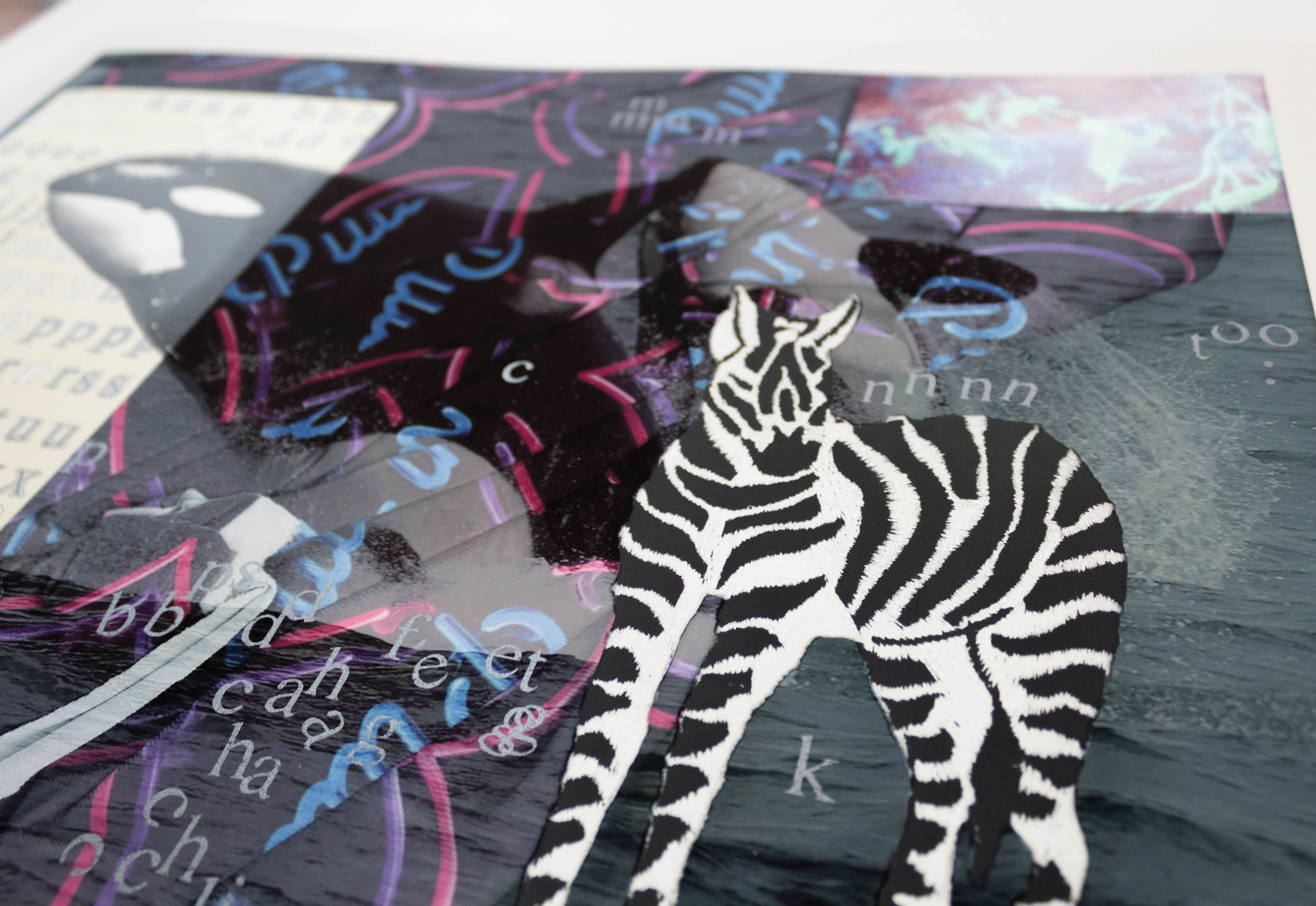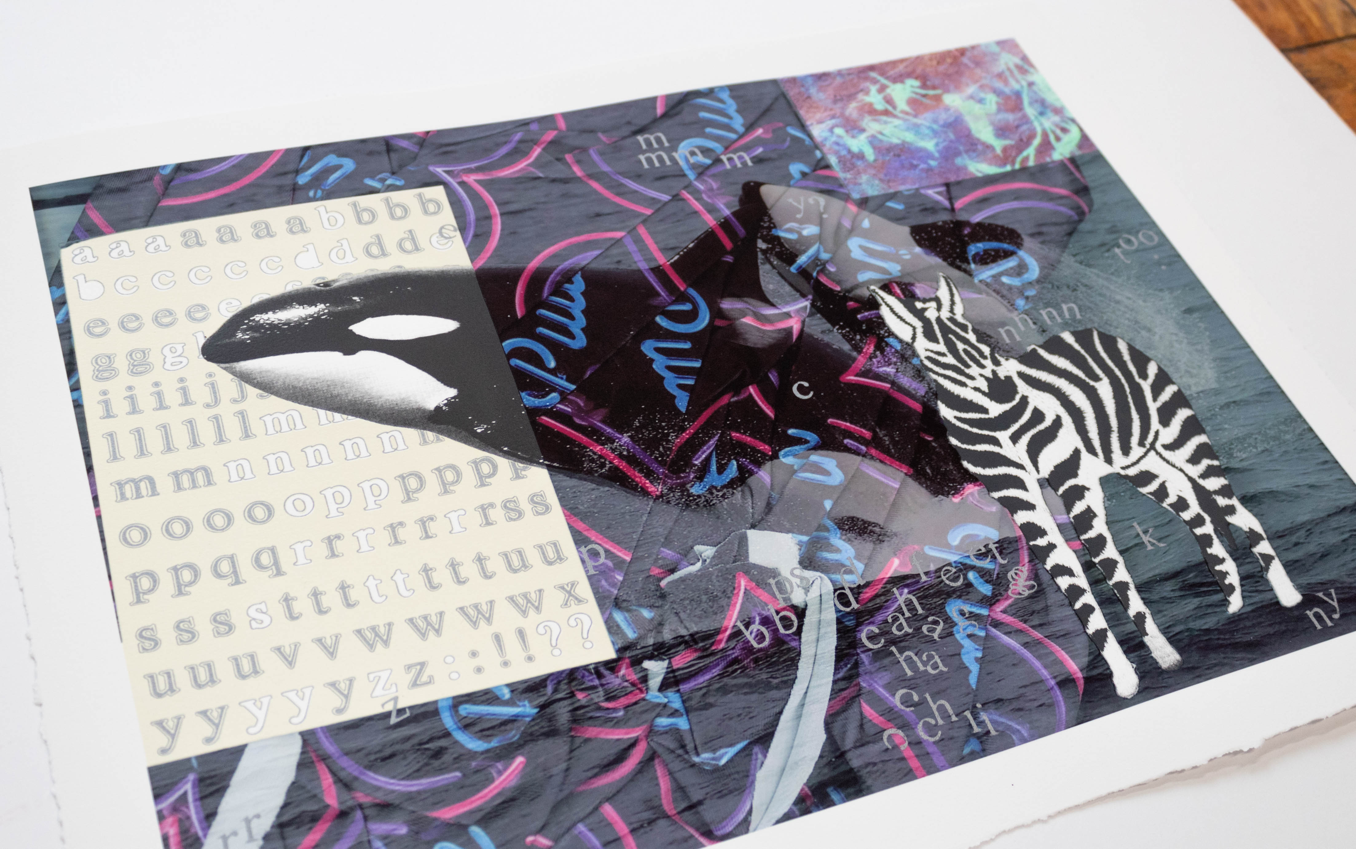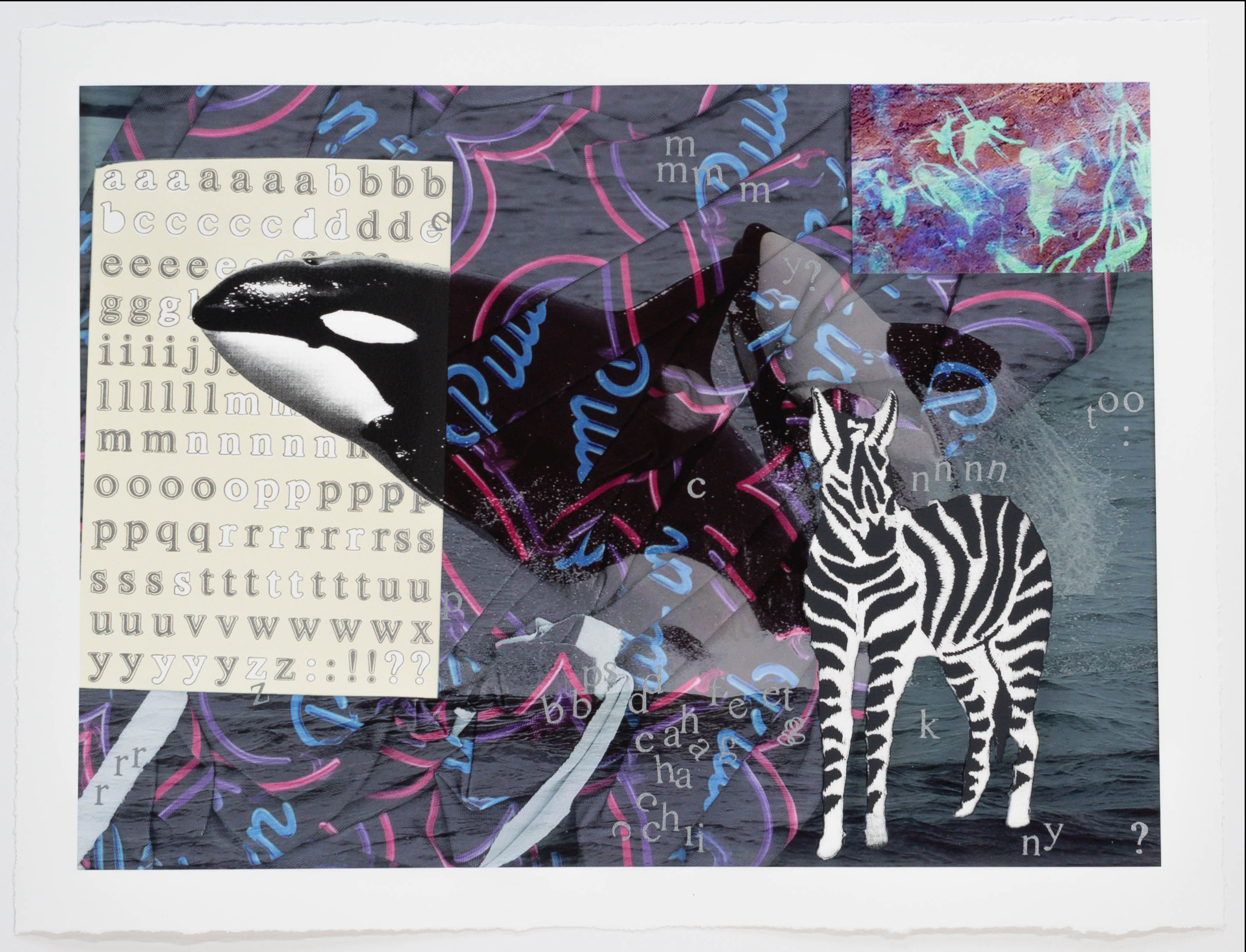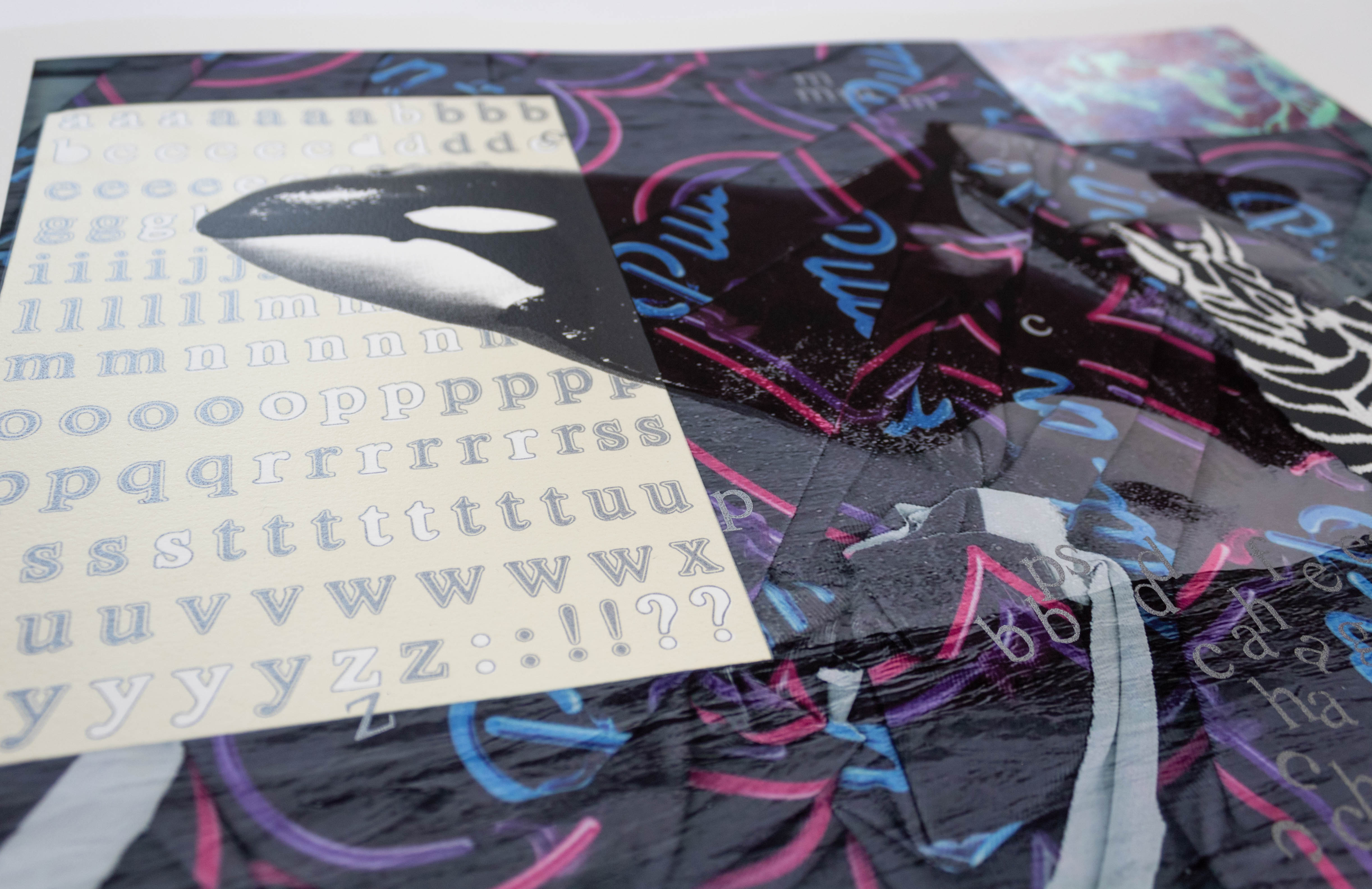 nnnn too is Erin Hayden’s first exploration in printmaking: a multi-media collage about the interconnectedness of living beings, ideas, and dreams. Working back and forth between screenprinting and digital imagery, Hayden used glossy and metallic inks for subtle effects that compliment the oceanic, textual, and playful content of the work. nnnn too lets us look into the artist’s mind where images emerge as a placeholder for thoughts, and the creative process is one of decoding or connecting seemingly disparate visuals using intuition and improvisation to place them in relationships. Most recently, her research has been inspired by the intelligence of orcas and dolphins, as well as heartbreaking numbers about their dwindling populations. Believing that we are all a support sustem of connecting living things, Hayden’s work creates an ecosystem for her oracs to live in, where stickers and cave drawings of mermaids exist alongside raw blocks of language. As her imagery coalesces in moments, and breaks apart in others, we are reminded of our own precarity on this planet and how much we don’t know about this world’s magic.