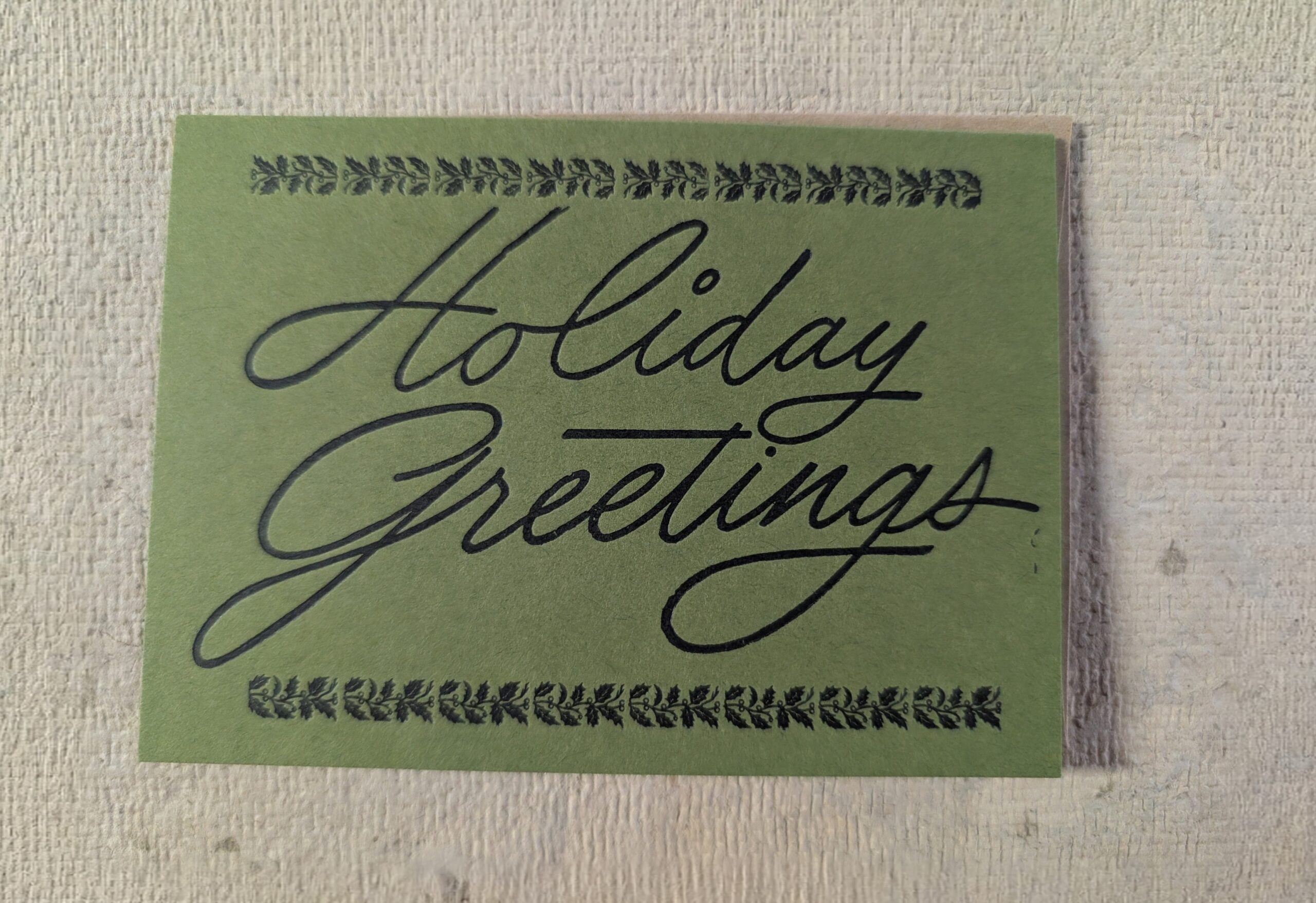 Deep green cards printed by hand on the letterpress offer a rich, seasonal feel. Each pack includes five cards with matching envelopes, sized 4.5″ × 5.75″. The interiors are blank, giving you plenty of room to write and share holiday warmth.